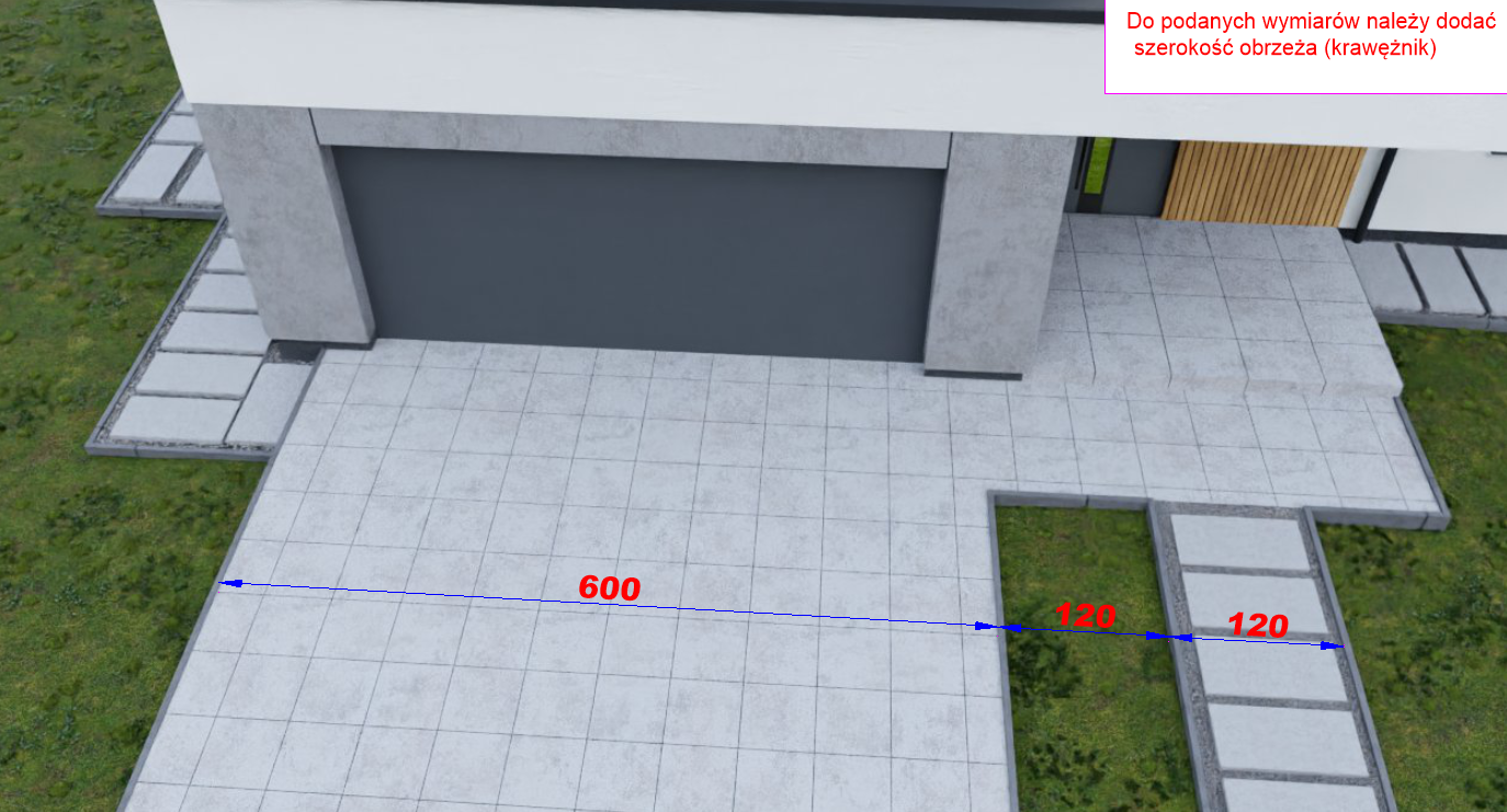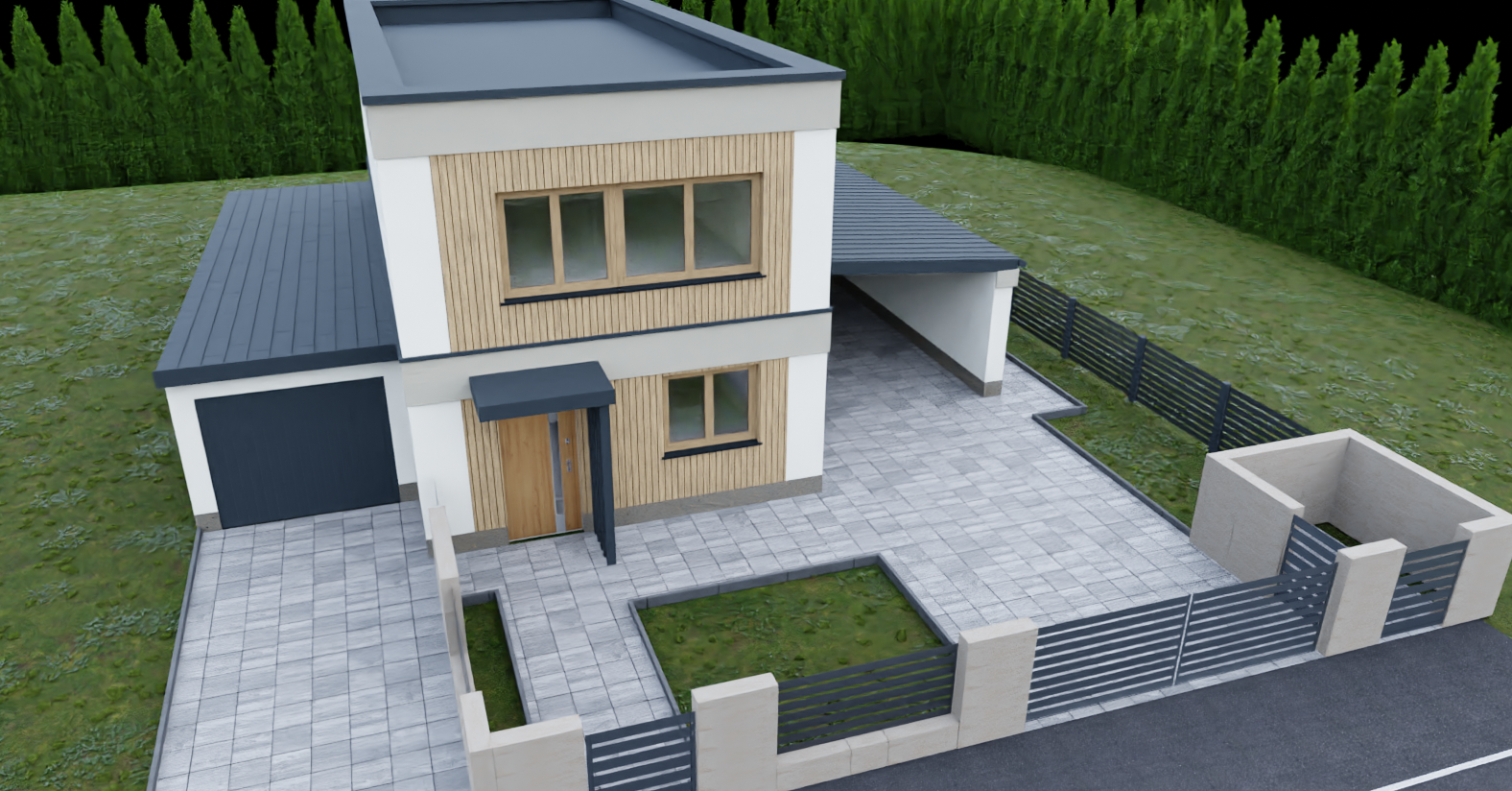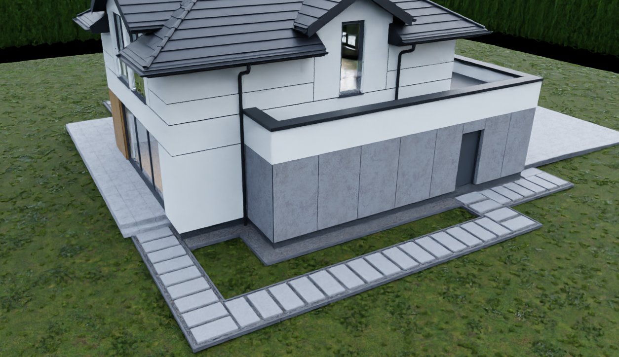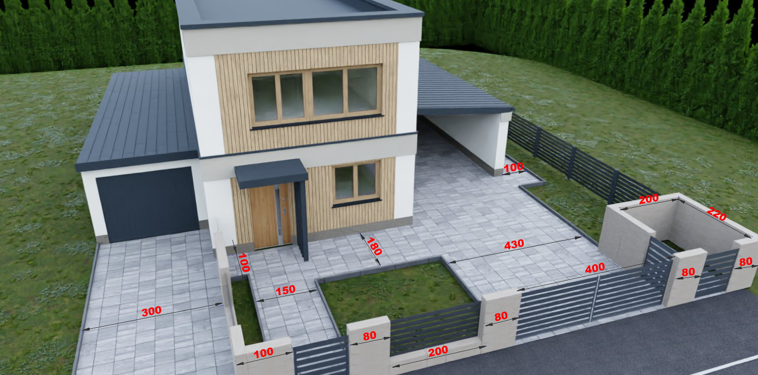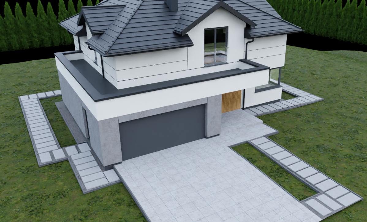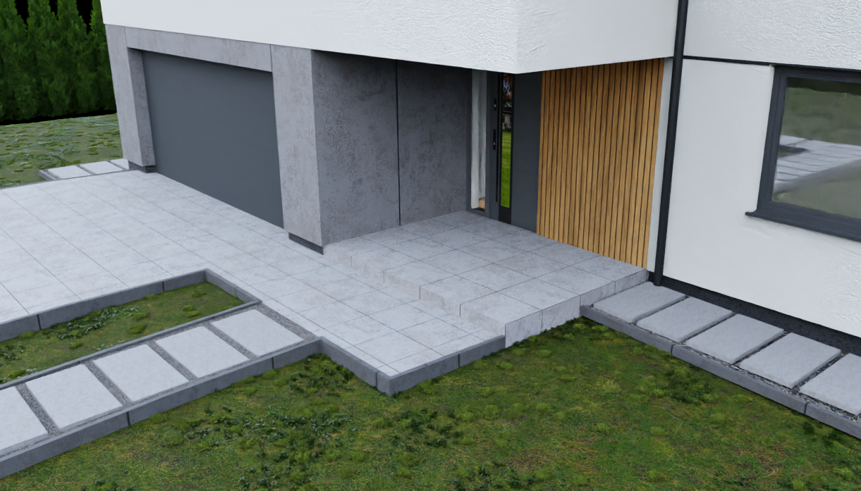 Projekt podjazdu – wizualizacja poglądowa podjazdu np. z kostki brukowej, mająca na celu wskazanie orientacyjnego kształtu oraz podanie propozycji materiału wykończeniowego, z którego można go wykonać, aby idealnie komponował się z elewacją.