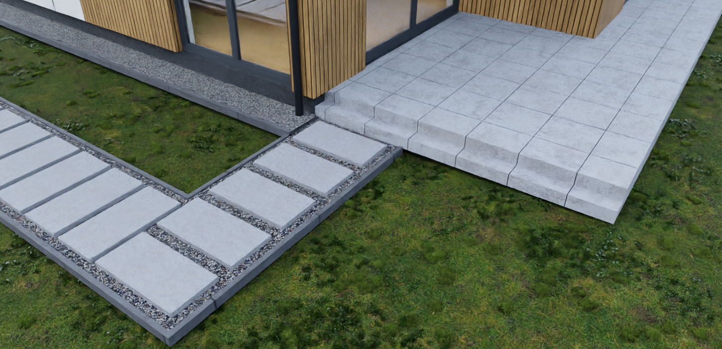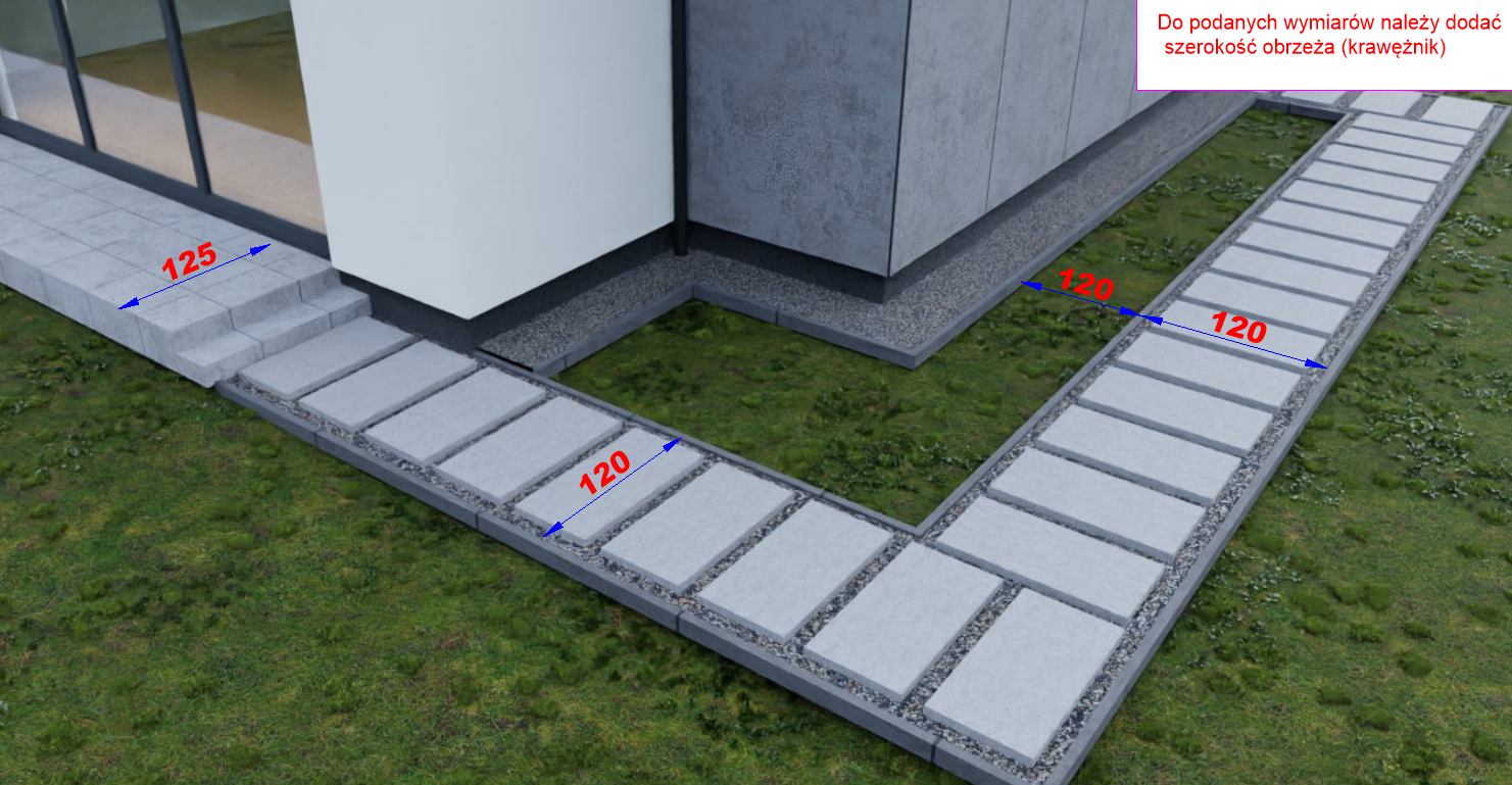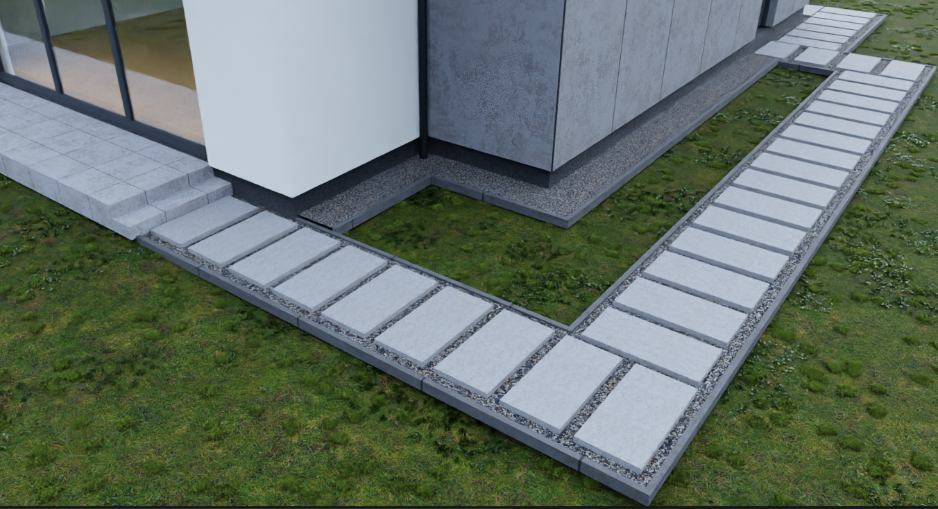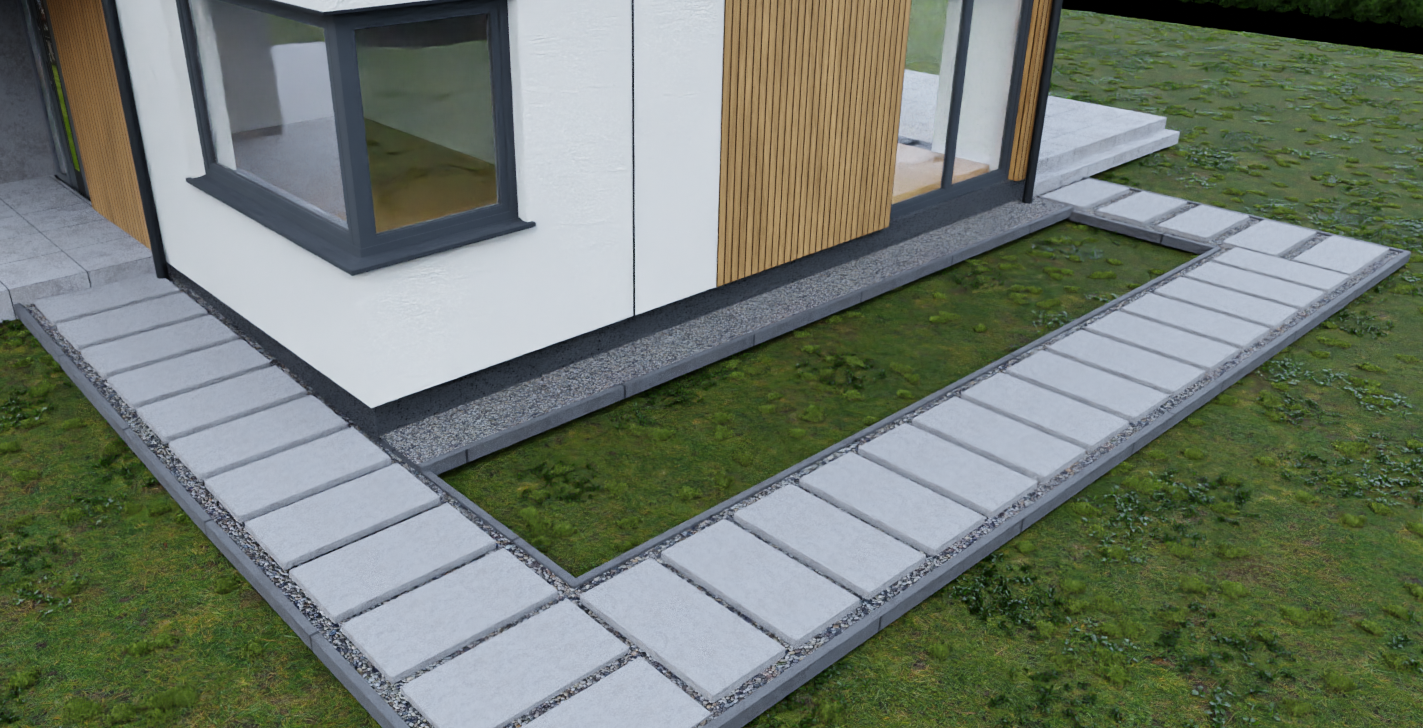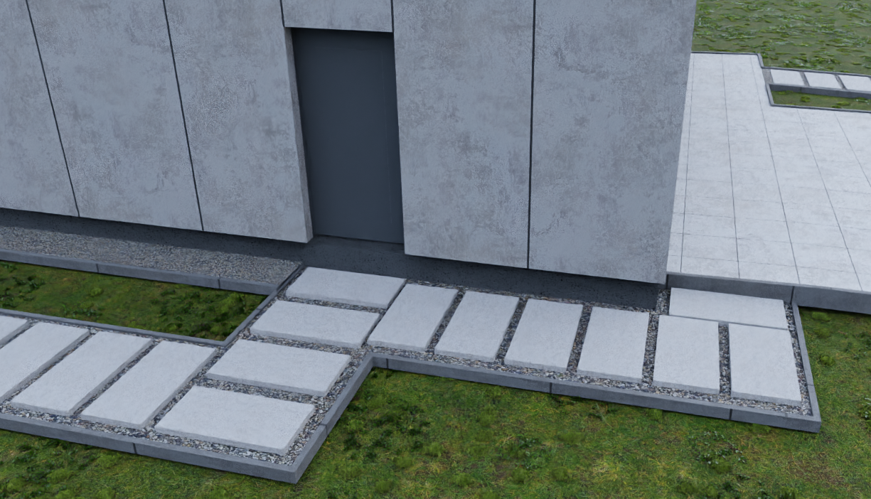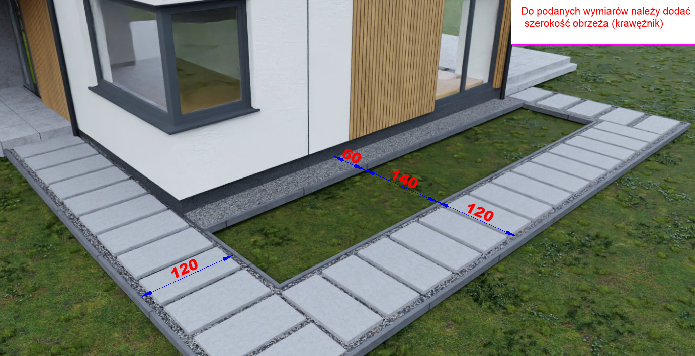 Projekt podjazdu – wizualizacja poglądowa podjazdu np. z kostki brukowej, mająca na celu wskazanie orientacyjnego kształtu oraz podanie propozycji materiału wykończeniowego, z którego można go wykonać, aby idealnie komponował się z elewacją.