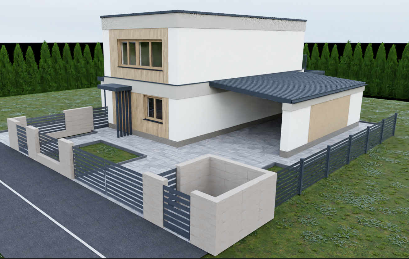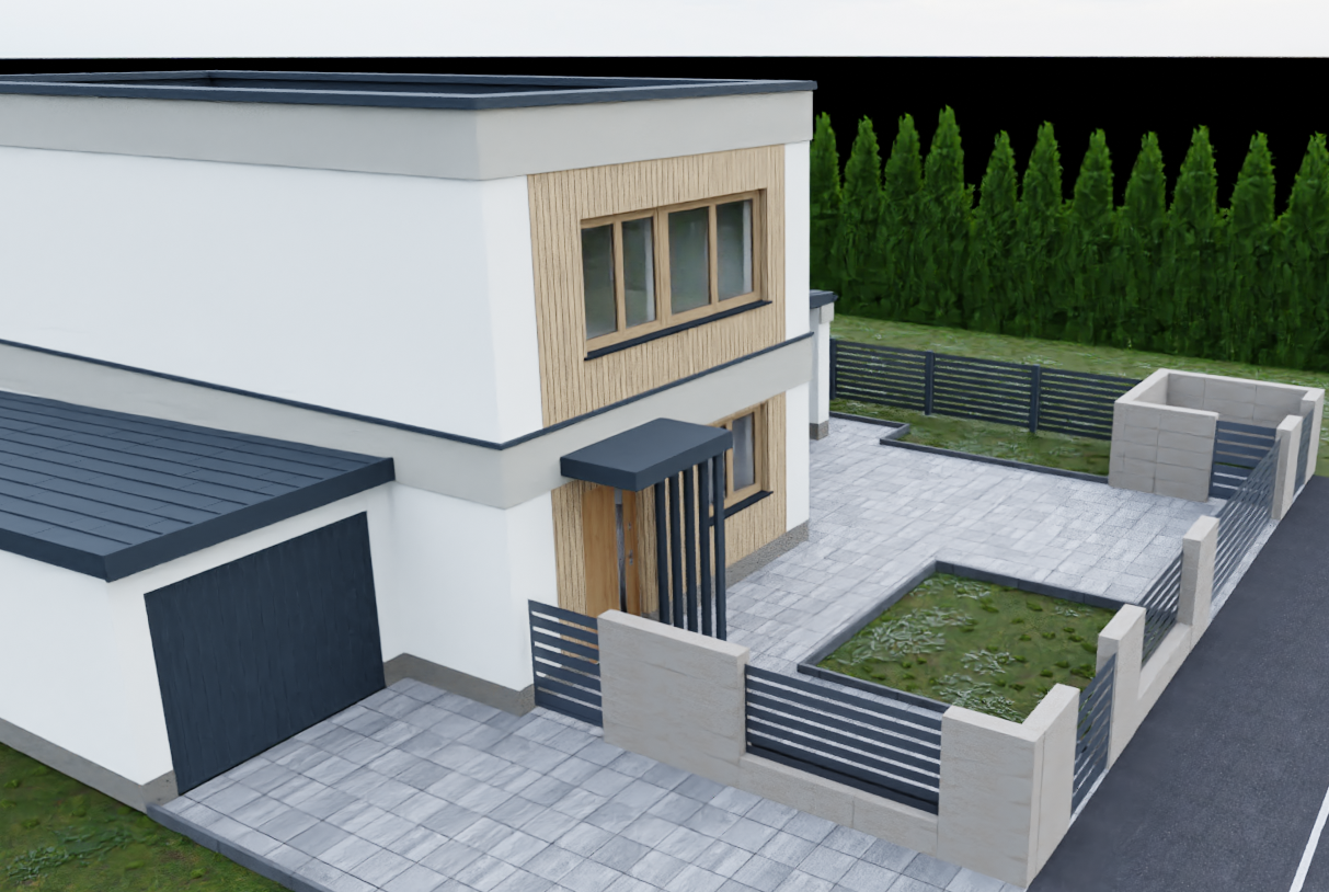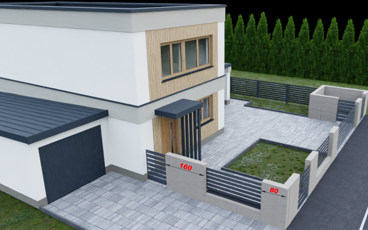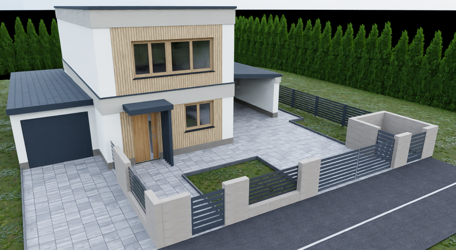 Projekt ogrodzenia – wizualizacja poglądowa ogrodzenia, mająca na celu wskazanie orientacyjnego kształtu oraz podanie propozycji materiału wykończeniowego, z którego można go wykonać, aby idealnie komponowało się z elewacją.